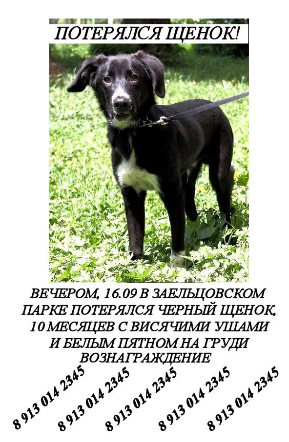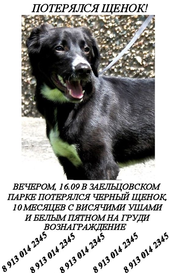Сегодня вечером (16.09) в Заельцовском парке потерялся Микки, черный подрощенный щен (10 мес.) с висячими ушами и белым пятном на груди. Просьба всех видевших/нашедших звонить по телефону 8 913 014 2345. Сегодня Марина с друзьями искала его 5 часов подряд до кромешной тьмы, завтра посветлу она вновь поедет на поиски, в любых поисках очень важны первые сутки, все кто может помочь в поисках свяжитесь, пожалуйста, с Мариной.