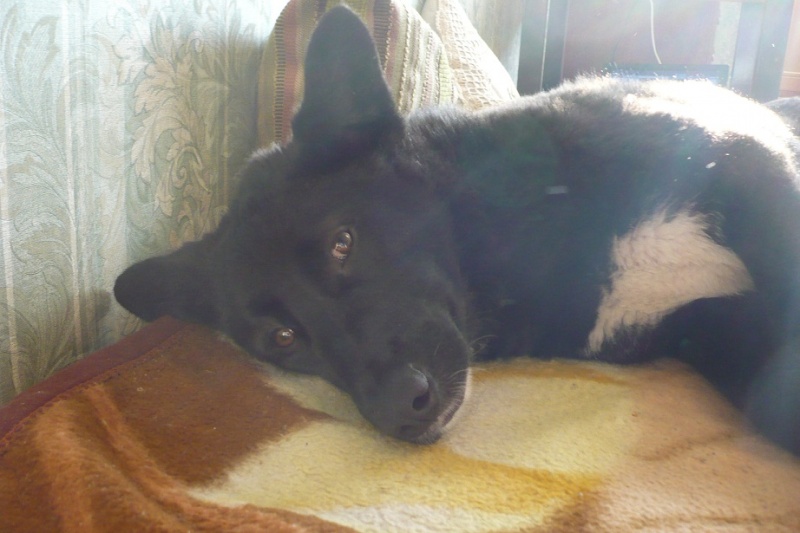 Поспрашивайте знакомых, может пожилых людей. Собака дома очень спокойная, тихая. Лежит рядом с людьми, любит гладиться, подставляет пузико.