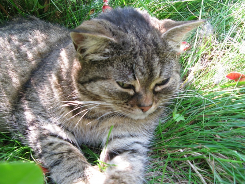 Окрас пестрый-полосатый: спинка серая с темными полосками, пузо светло рыжее с серыми пятнышками,