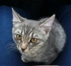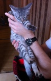 Светло-серый полосатый мальчик, на вид 3-4 месяца, худой. Не грязный, не похоже на то, что он долго был на улице. Показали ветеринарам, сказали, что внешне выглядит здоровым. Сейчас он у нас дома, накормлен и обогрет.