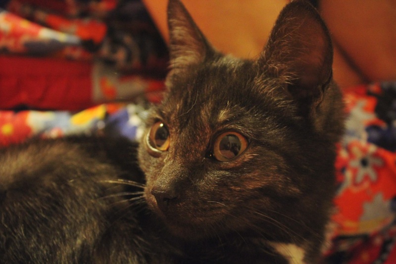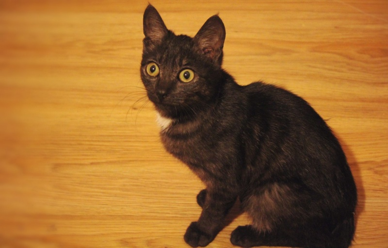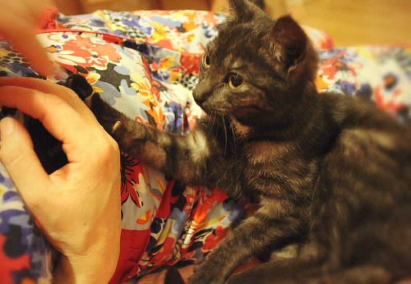 Ей около 5 месяцев, черная с черепаховыми пятнышками, подшерсток белый. Любит сидеть на руках, сразу успокаивается и засыпает.