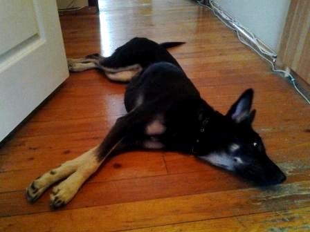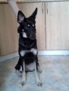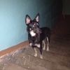 Уже сутки находится у меня дома. Порода дворовая-изящная. Гладкошерстная. С ошейником. Окрас темная с подпалами.Сука.