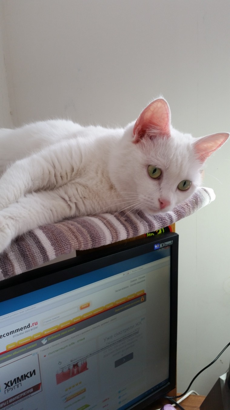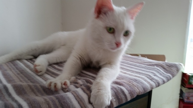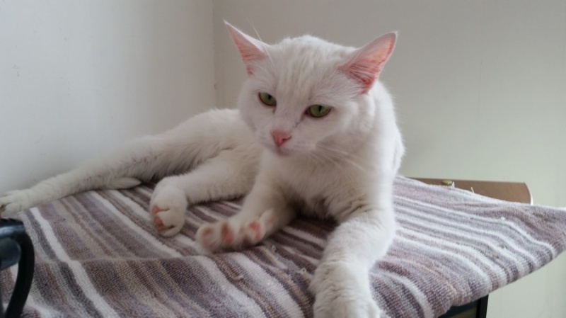Нос розовый, глаза зеленые. Чистая, ухоженная – бывшая домашняя.