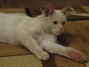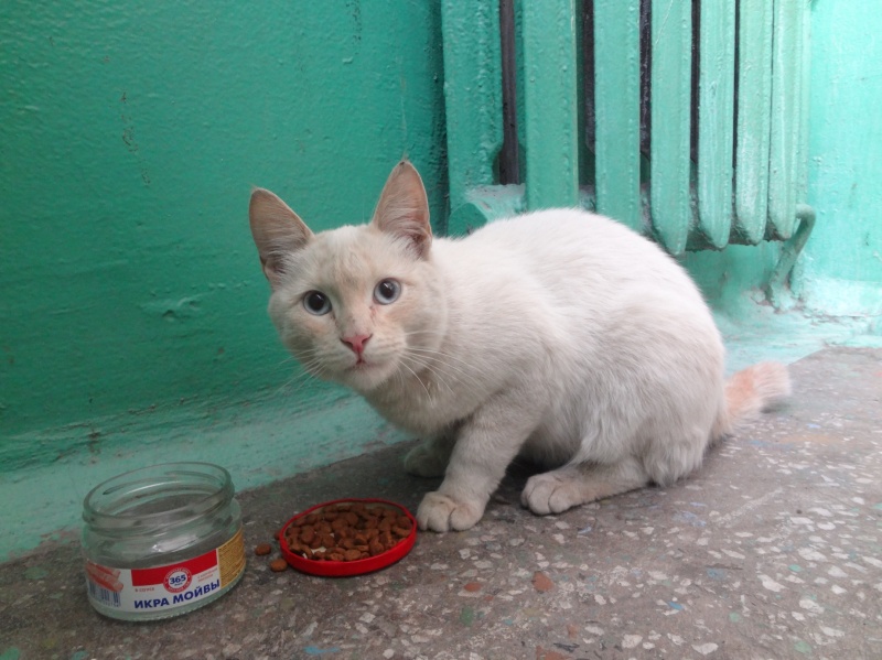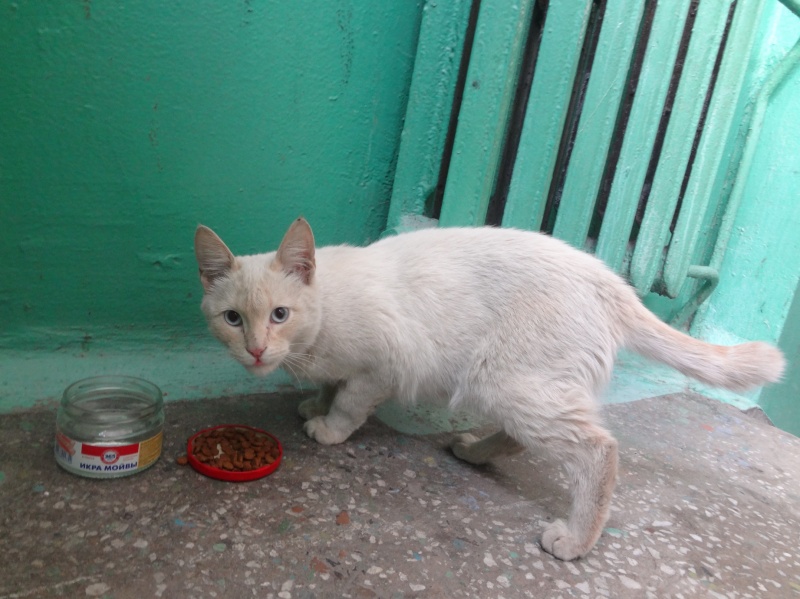 В подъезде появился котик, очаровательное белое создание с голубыми глазами. Появился вчера утром, вечером куда-то убежал, а сегодня опять лежит на нашем коврике. Может быть убежал у кого-то, на подвального не похож, а для домашнего слишком худой. К себе к сожалению взять не могу, посмотрите может быть кто-то ищет или сможет взять к себе на воспитание. Территориально: левый берег, сов.сибирь