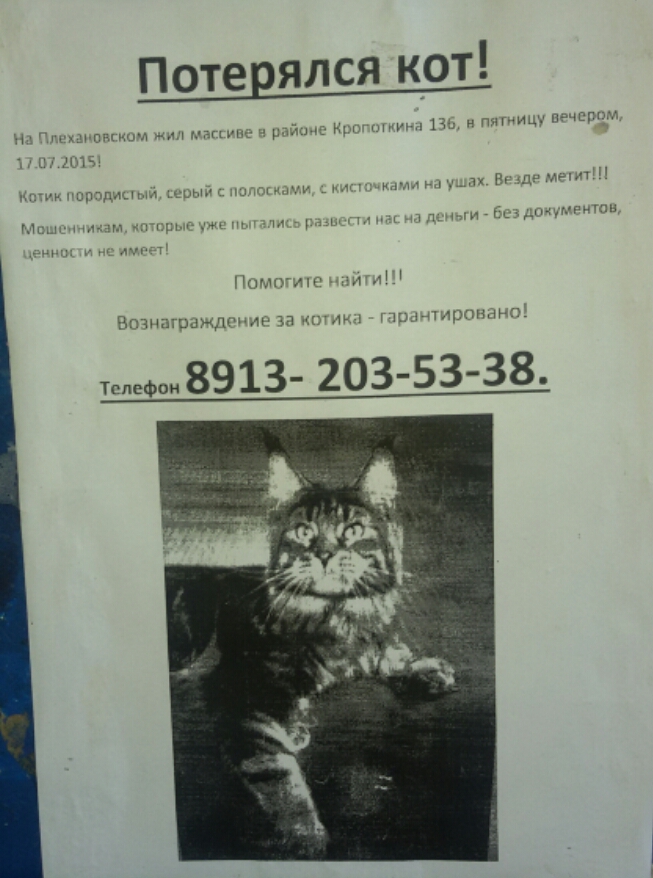 Ответ на сообщение Потерялся кот. Плехановский ж/м. пользователя ИRИNА