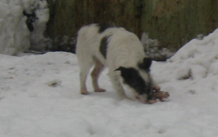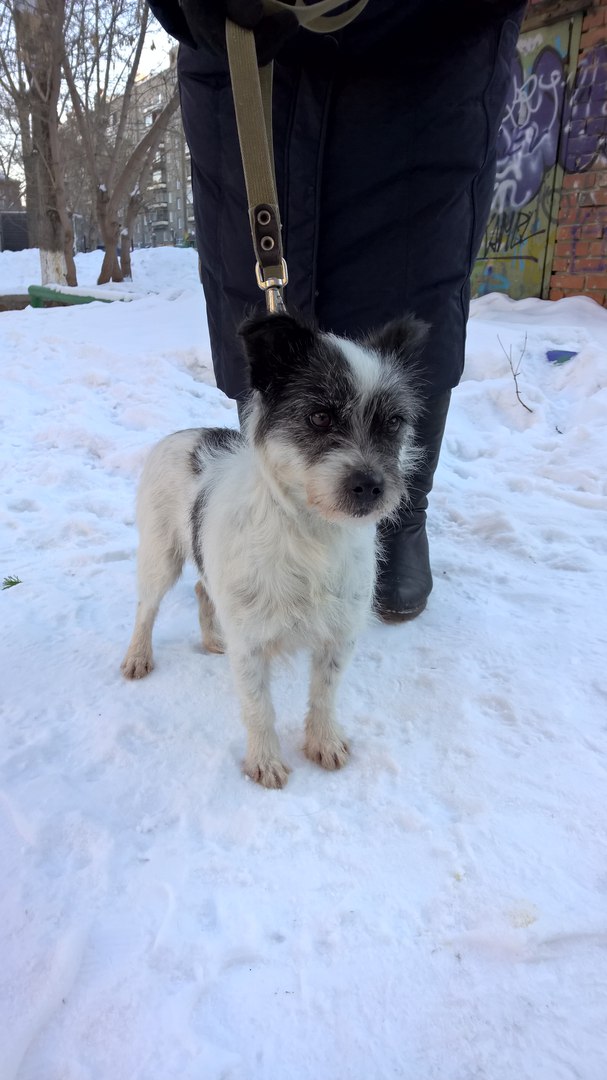 Собачка ниже колена, сразу видно, что была домашней. Живет под открытым небом.