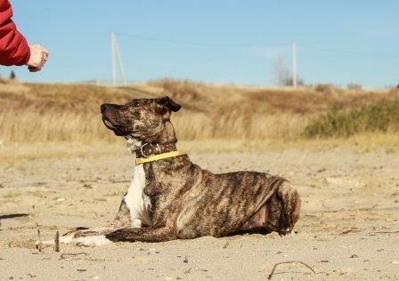 Наша курируемая Барса потерялась у новых хозяев. Метис стаффа, тигрового окраса, грудь белая, передние лапки( носочки) тоже белые.