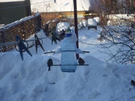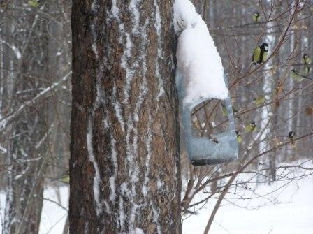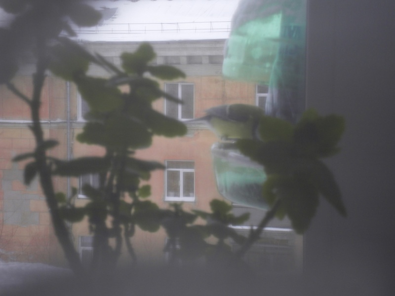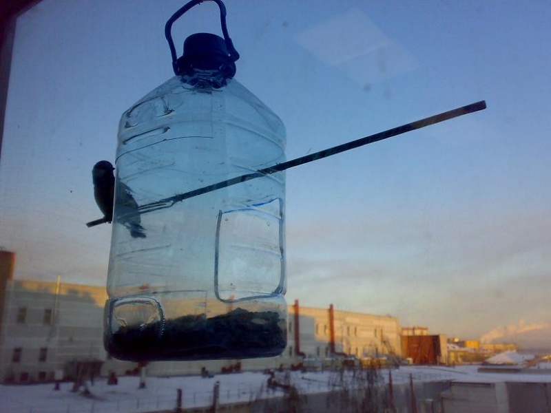 Пластиковых бутылей больших дома нетУ меня хоть и осталась пара штук в заначке, пока решил попробовать сдвоенную конструкцию из тетрапаков. Отступил пару сантиметров от донышка, вырезал прямоугольное отверстие с одной стороны и "спина к спине" привязал скотчем к перекладинке на балконе, дополнительно зацепив им же за донышко за перила. Синички оценили две такие сдвоенные конструкции, осталось проверить на голубеустойчивость. ))) Семечки на Волочаевском нынче по 50/75 за кг, надо проверить, что там на рынках или у оптовиков.