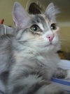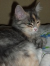 В своем юном возрасте эта кошечка уже натерпелась бед. Родилась в подвале, где и была найдена. Долго и успешно скрывалась от своих спасителей в темных закоулках, боясь, что ей сделают плохо. Но, когда все же оказалась в добрых и заботливых руках, почти сразу успокоилась.