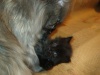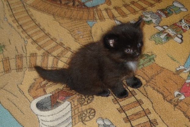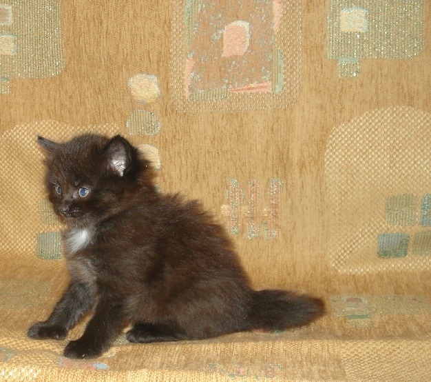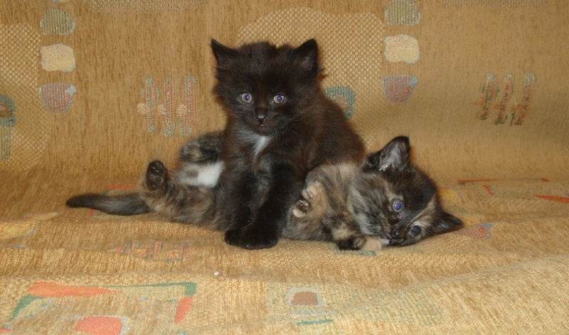 Очень пушистая черная кыса, сейчас с удовольствием ест кашу с мясом, сама ходит на горшок и дни напролет играет с сестрами. Сестры также представлены в этом разделе)))