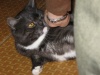 Окрас очень интересный: черная, а подшерсток белый, на свету на лапах просвечивабт полоски, а на боках-пятнышки. Кошка крупненькая. Мордочка выдает помесь с британцем.
