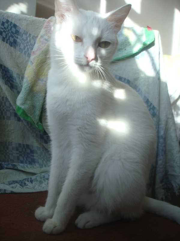 Молодая кошечка, примерное 1 год, лоточек у нас на 5+, лопает сушку, но не против и натуральной еды. Безумно ласковая, мурчательная, активная девочка. очень любит когда ее берут на руки, любит лежать рядом с хозяином и нежиться на солнышке. Маленькое белоснежное чудо