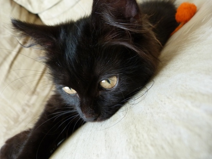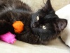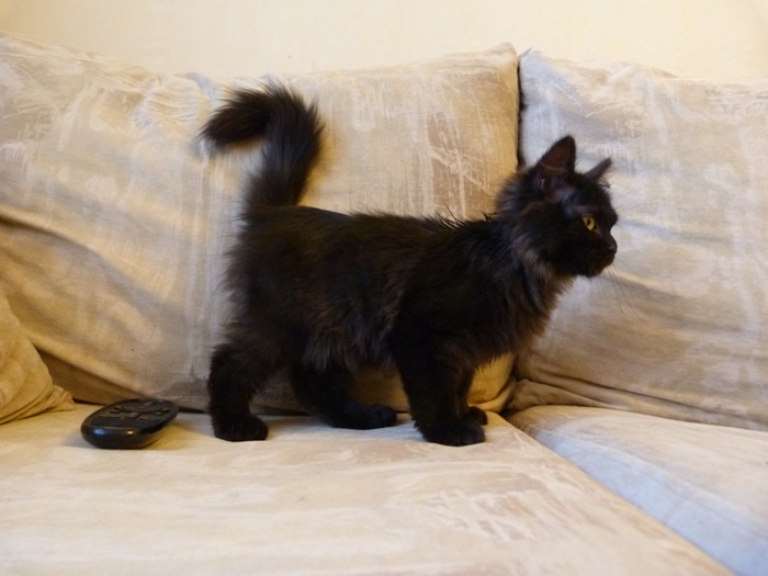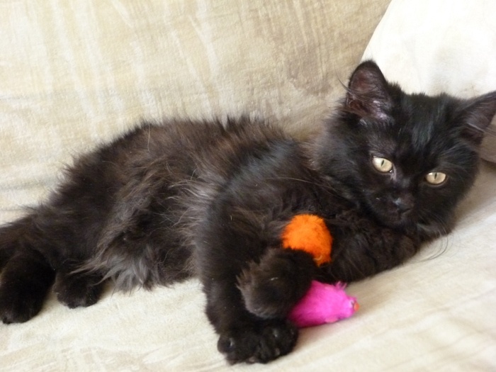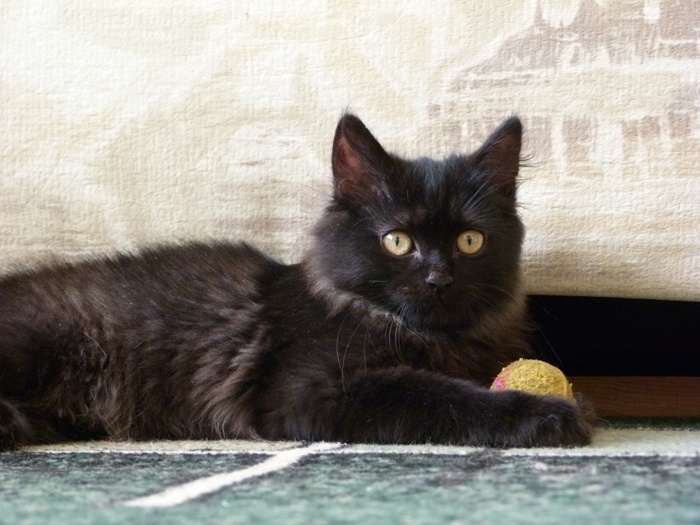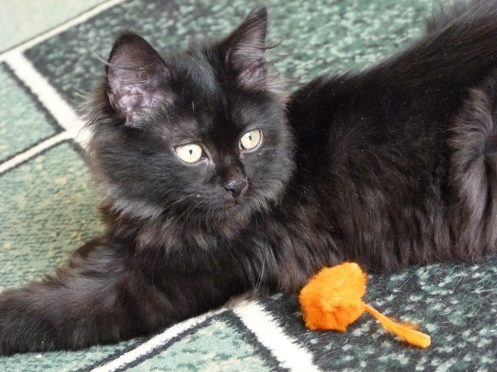 Но в тоже время он еще и бандит, бегает, прыгает, играет и в процессе игры засыпает, потом соскакивает и опять помчался по делам. Лоточке нашел сам и сразу, он большая умничка. Хоть такая корова и нужна самому, НО... мы ищем самых лучших во всей вселенной хозяев, чтоб Уголек мог отдать всю свою ласку и любовь и получить то же в замен.