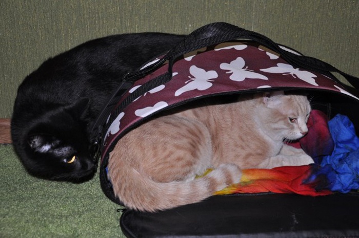 Мой кот и раньше проявлял интерес к гостям, но тут просто ни на шаг не отходил. К вечеру дети уже почти не шипели друг на друга, но абориген не переставал таращиться на пришельца. С утра котейки уже вовсю дружились-носились-бесились по комнате, снося, буквально, всё на своем пути. А вот с собакой у котика отношения не сложились, поэтому такое соседство в будущем доме нам совсем не подходит.