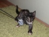 Вот такое чудо попалось мне в подъезде, когда я вышла выкинуть мусор, маленькая, размерами с ладошку, худенькая, огромные уши и глазищи, вся в паразитах, просто ужас. Сейчас девочка отмыта, избавлена от всех паразитов, с удовольствием ест сушку и ходит по всем своим делам строго в лоточек.