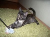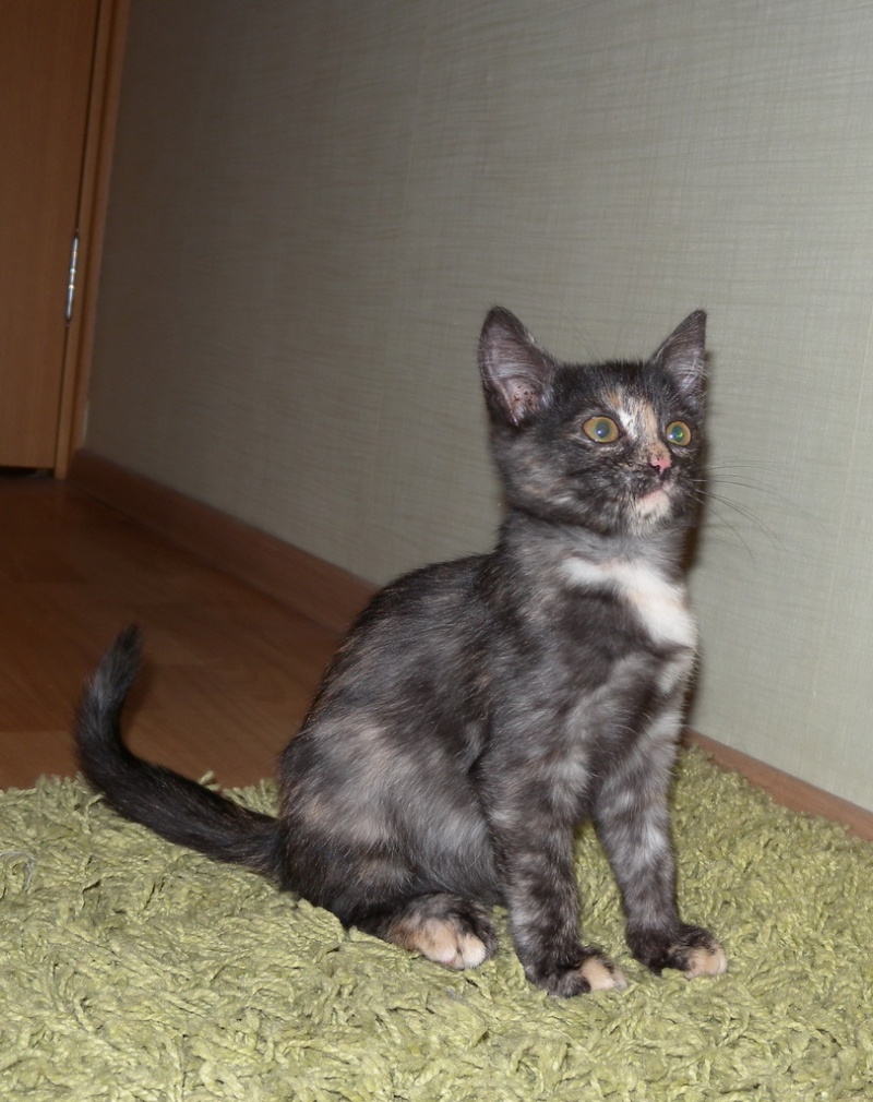 По возрасту ей где-то между двумя и тремя месяцами. Будет с гладкой короткой шерсткой, непушистая. Девочка очень активная, очень ласковая, невероятно ориентирована на человека, мурчит как трактор, просится играть и на ручки, будет отличным компаньоном для человека, к моим кошачьим вполне лояльна, пытается с ними тоже играть, но аборигены гостью встретили не очень-то приветливо, поэтому малышка вынуждена находится в выставочной палатке.