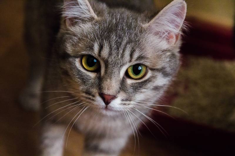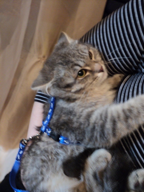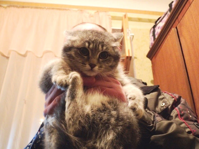 На руках Анфиса сидит спокойно, ластится, но если отпустить, то убегает и прячется.