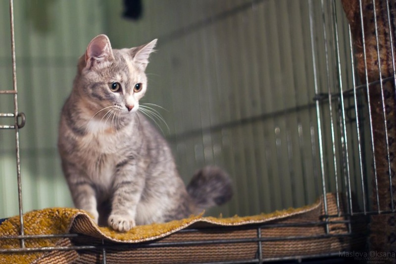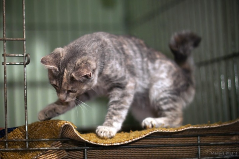 3 мес. Вся кошачья нежность и грациозность воплотились в этой малышке! Мурлычет постоянно. Котейке сильно не хватает тепла человеческих рук! Она скучает по людям, сидя в клетке... Хвостик у этой красотули коротенький, 10 см примерно, от природы – сложная смесь пород.