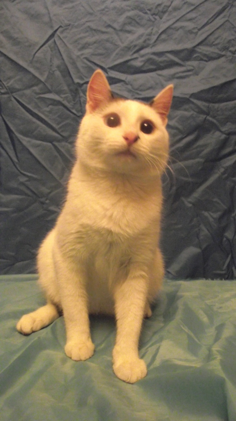 Красота у нас суровая, северная. Голубые глаза, белый мех немного под тайца. Главная наша красота – характер. Спокойный, рассудительный. Любит кататься на любых средствах передвижения (смотрит в окно), любит детей. Когда ему становится что-то интересно – глаза начинают жутко косить. На носу прикольное черное пятно. К сожалению, котенок в последнее время откровенно голодал и еще не отъелся.