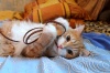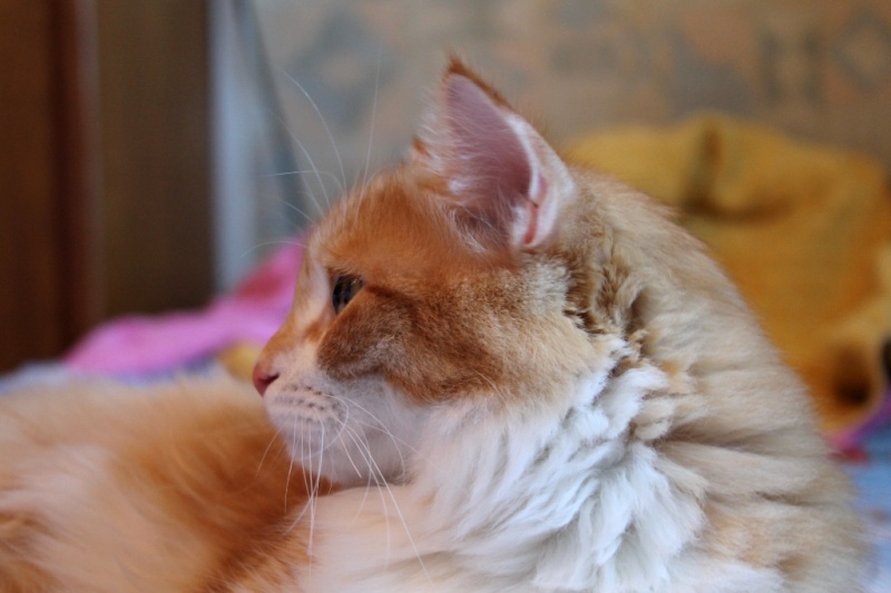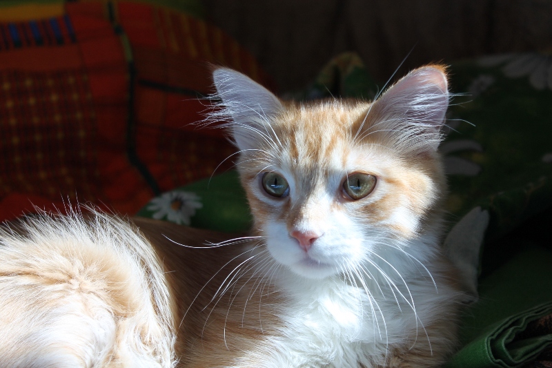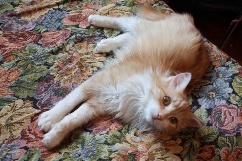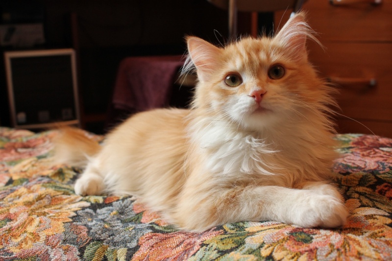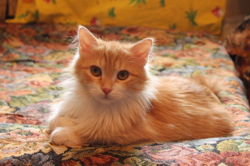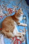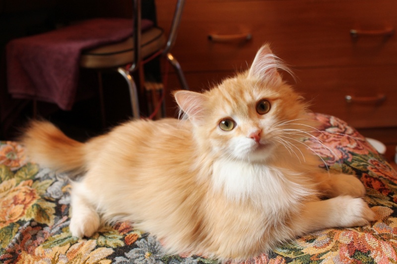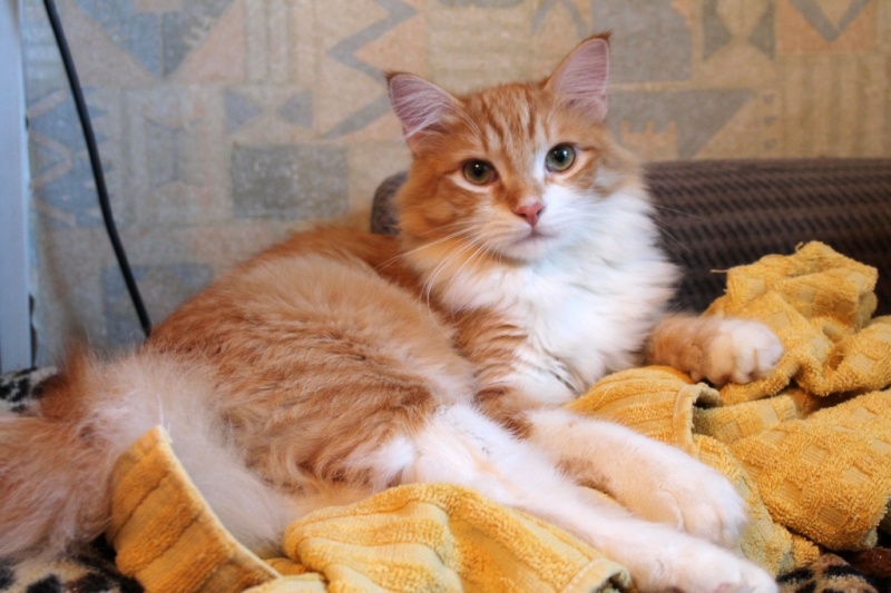 Окрас рыжий (ближе к кремовому) с белым, полудлиношерстный, но шерсть не склонна к колтунам, помесь с бобтейлами (плоды горе-разведенцев) и как следствие укороченный хвост.