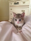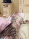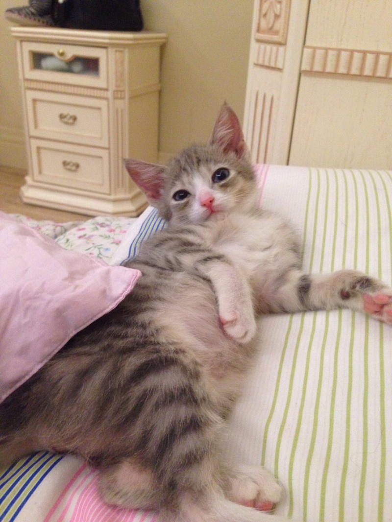 Оказавшись на ручках, начинает тут же урчать. Лоточком пользоваться умеет.