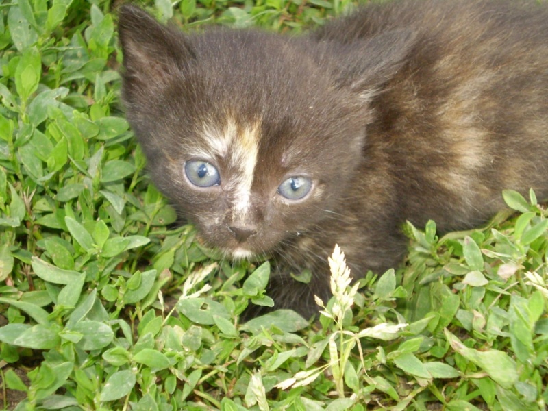 4.5. На фото: черный котенок с небольшими интересными пятнышками на мордочке, спинке и на лапке имеет светлый пальчик - глазки пока голубые / вроде бы девочка (проверим точно) / ещё крошка - учится есть сама / мама короткошерстная (отлично ловит мышей, кстати).