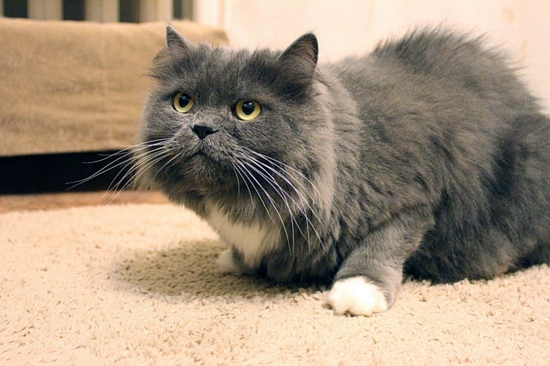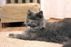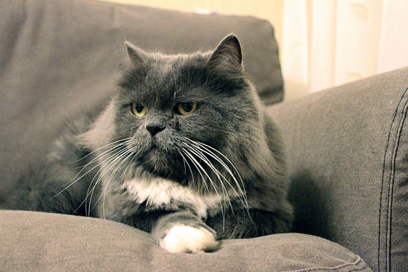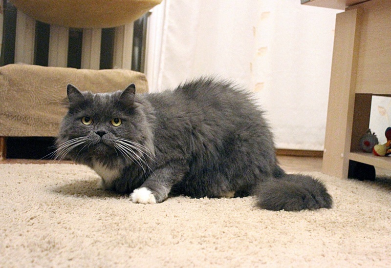 Наш котик обладает роскошной длинной шерстью благородного серого окраса, на лапках белые перчатки, на груди манишка. Также его отличает пронзительный взгляд больших серьезных глаз, шикарные усы и невероятно красивые щечки, которые так и хочется потрепать и почесать, что, кстати, Микки очень одобряет! Шерстка требует несложного ухода, на данный момент парень обрастает после стрижки, на ощупь его шубка нежная, велюровая - очень приятная)