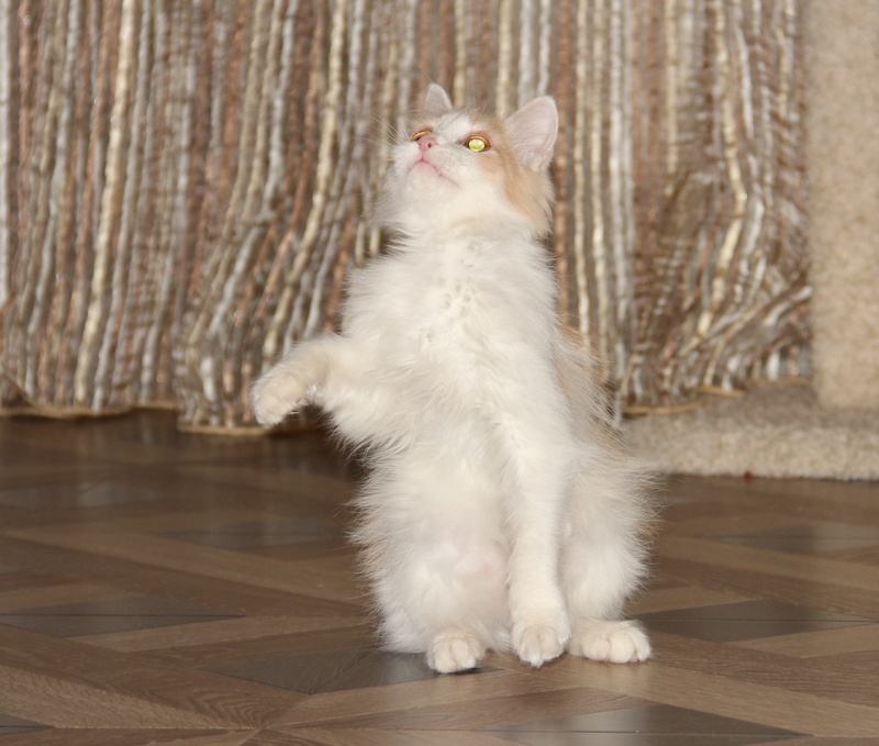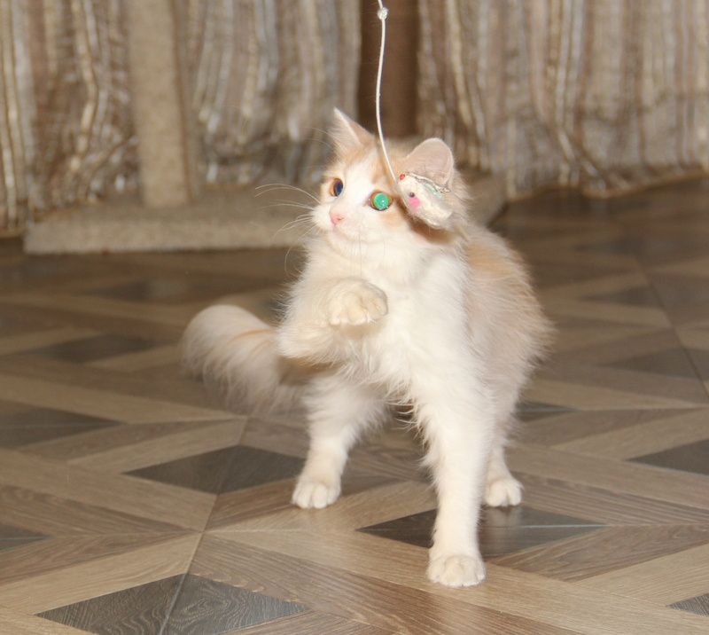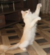 Обожает играть, может часами бегать с мячиком или мышкой, зато ночью крепко спит и никому не мешает. Очень любит ласку, если её погладить, она от удовольствия закрывает глазки и начинает тихонечко мурчать. Она совершенно не умеет мяукать, так что диким ором вас никто не разбудит)))