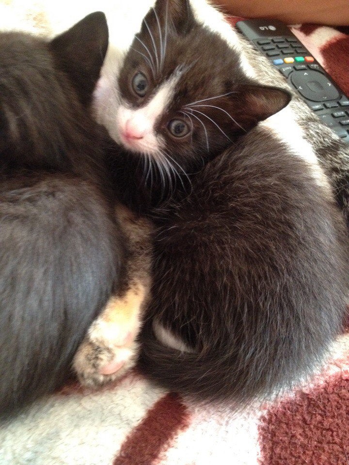 Отдам трех котят (мальчики) от очень воспитанной кошки. <3.2.2 ДЖ> Котята родились 7 июля, двое черных в белых носочках, один-очень необычного окраса-серый на лбу рыжее пятнышко и полоски рыжие. Котята кушают молоко, беспрекословно ходят в лоток, очень ручные.