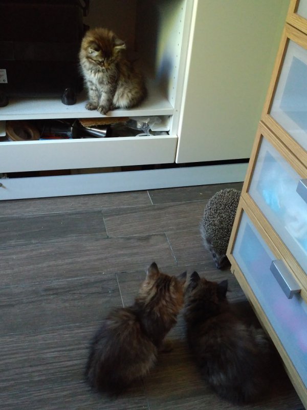 Приучены к сухому корму. Спокойно относятся к собакам и ежам
