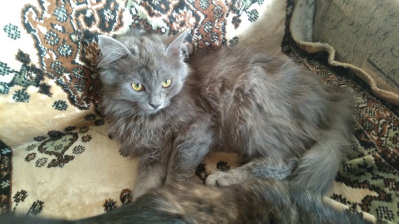 Была найдена на берегу Азовского моря, откормлена, отмыта и привезена в Новосибирск.