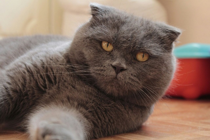 Похожа на британскую с висячими ушками. Окрас "голубой".
