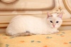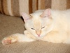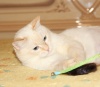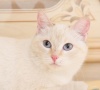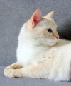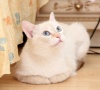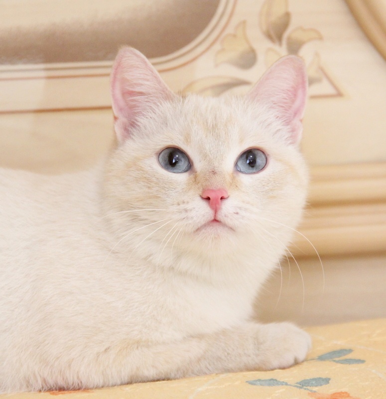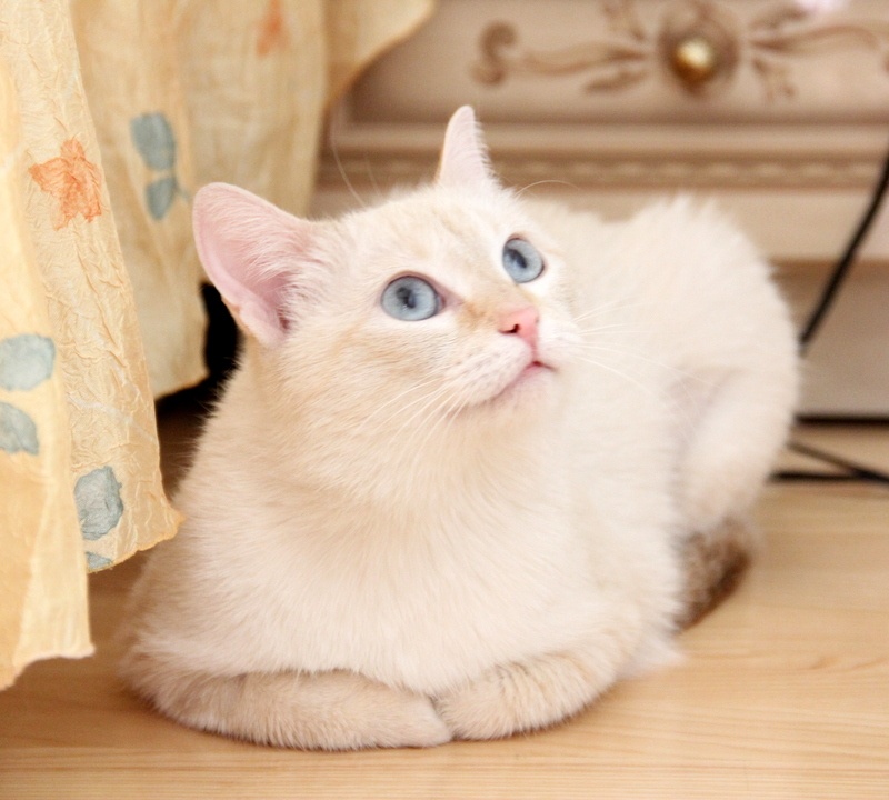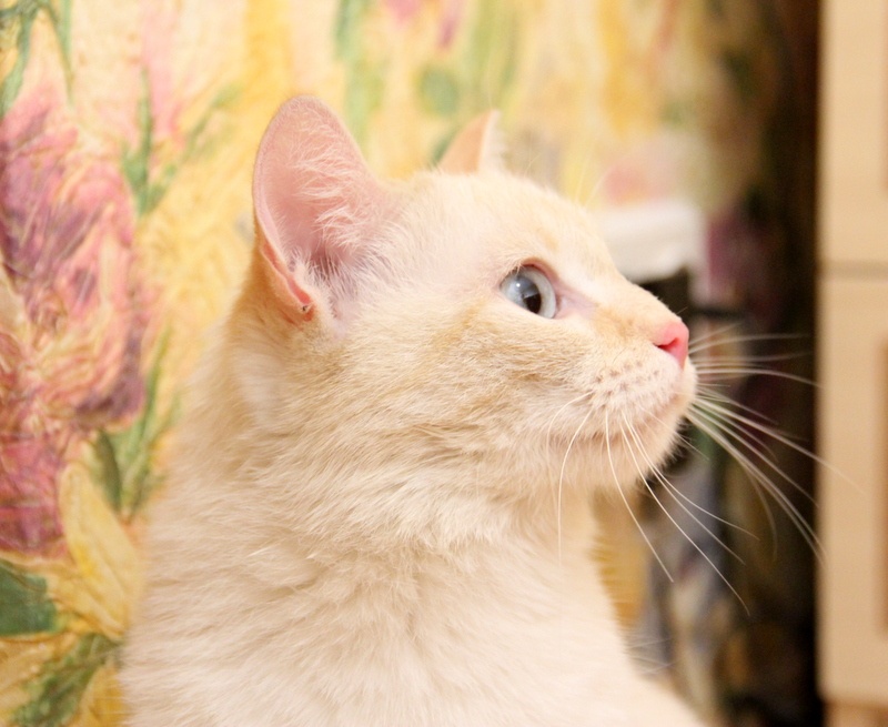 У неё огромные голубые глаза и редкий для кошки окрас ред-пойнт, красивая шубка с густым подшёрстком.