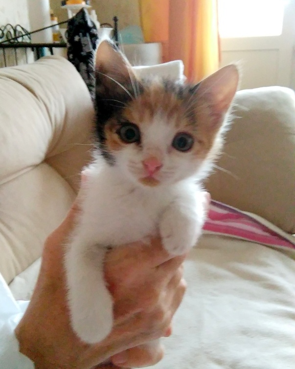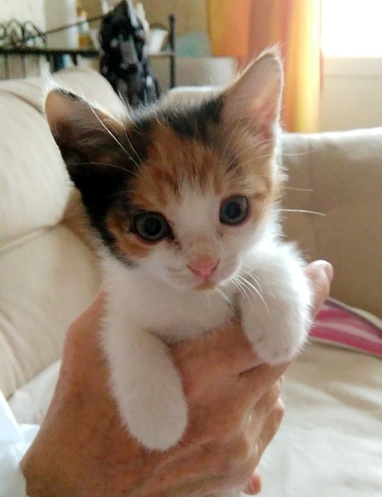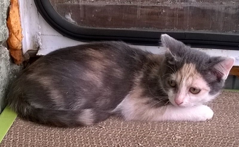 И к этой компании малышка Ириска. Ей чуть больше месяца. Милая, нежная трёхцветочка, трогательная ласкушка.