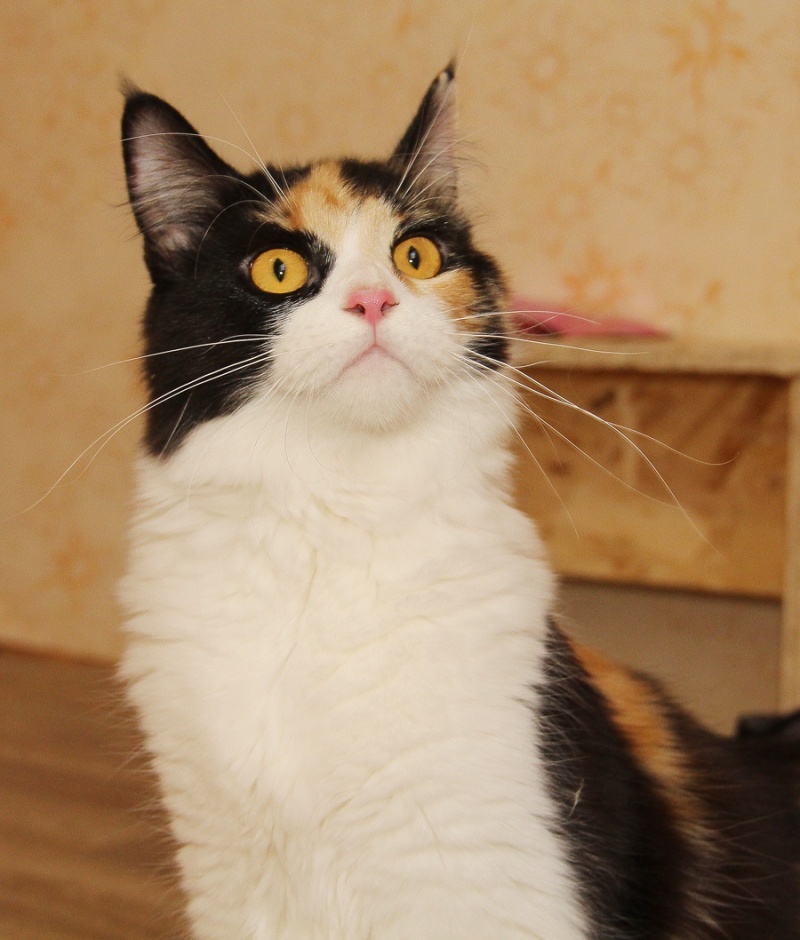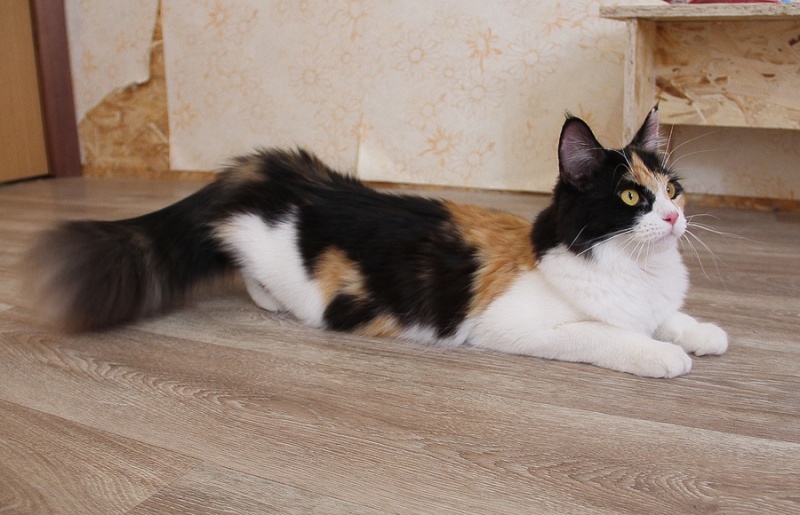 Кошка очень активная, не лишена охотничьих инстинктов, постоянно сидит на окне и ждёт, когда пролетит дичь, поэтому сетки на окнах-обязательное условие. Иначе улетит Майра за птичкой или мухой.