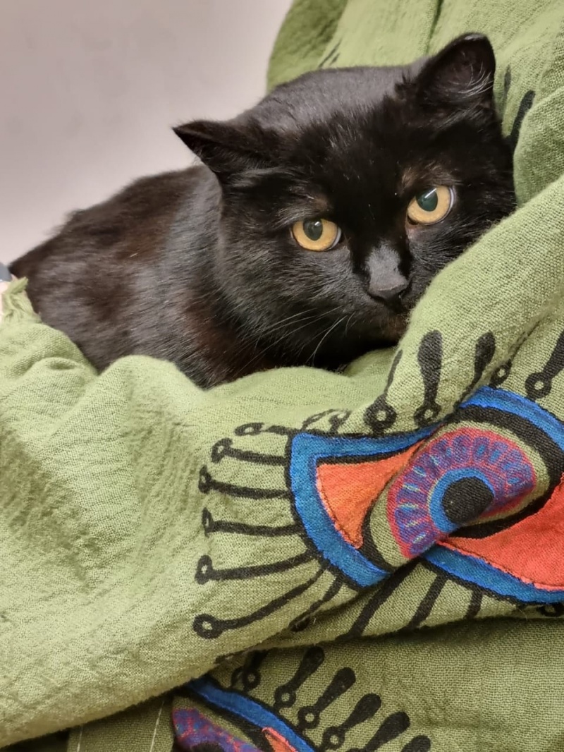 Сейчас Джуна в безопасности, но очень нервничает от смены обстановки и незнакомых людей, это и понятно, она не понимает, почему её забрали из родного дома и от любящей хозяйки. Но постепенно кошка привыкнет к новому дому и людям, если поймёт, что её любят и не желают зла.