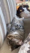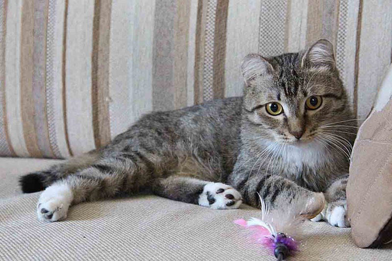 Но поначалу на новом месте котик будет очень стесняться и даже побаиваться. Вероятно, его обижали люди, потому что незнакомых людей он опасается, но через дня 3-4 уже освоится и начнёт играть.