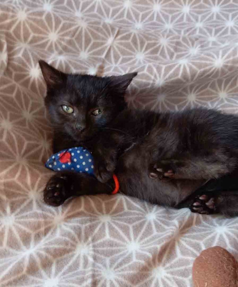 Их забрали на передержку с промзоны. Сначала малыши боялись, шипели, наверно, думали, что их хотят обидеть, а за них некому заступиться, ведь они сиротки. Но потом освоились, начали играть и даже приходят спать рядом. очень подружились с собакой, которая живёт с ними.