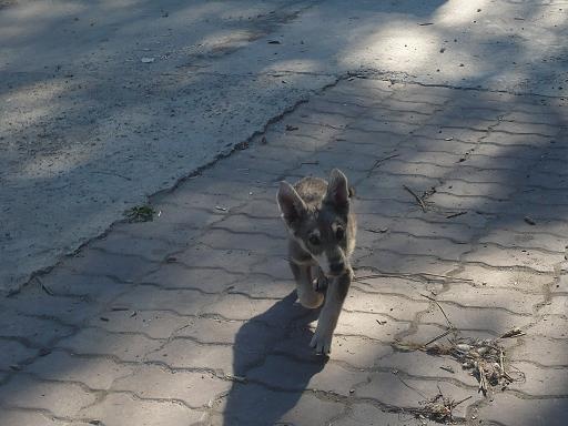 Мальчик очень красивый, одно ушко стоит, другое стоит не до конца. Окрасом на волка похож.