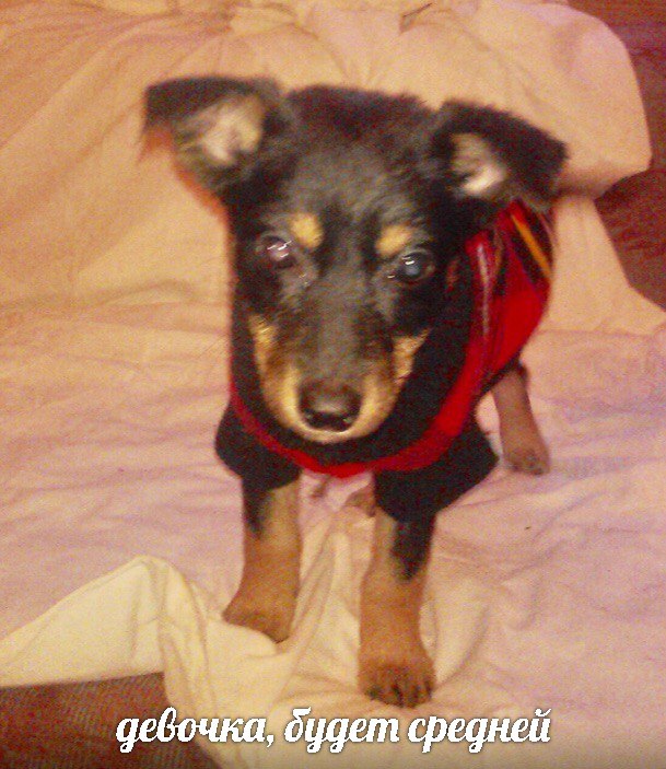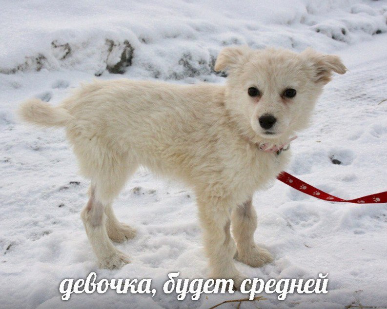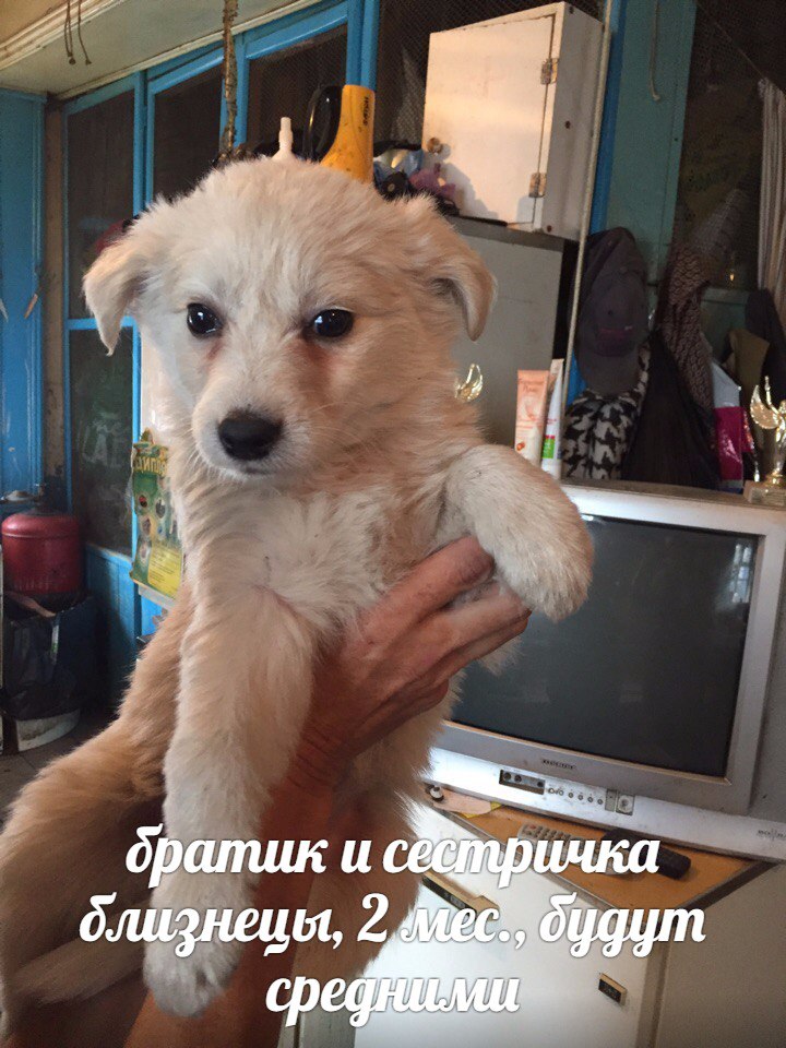 В приют подкинули маленьких щенков. Возраст около 1,5-2 месяца. Будут не большими. Беленькие близняшки, мальчик и девочка, будут средними (не выше колена). Черненькая с бежевыми лапками девочка также вырастет примерно по колено. Прелестные мальчик и девочка, совсем мелкие, когда вырастут, будут размером с таксу.